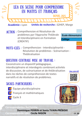 Dans la lignée de différents travaux actuels, notre projet vise à élaborer un dispositif pédagogique interdisciplinaire et interdegré combinant activités de discussion, de scénarisation et de théâtralisation dans les tâches de compréhension de textes narratifs et de problèmes mathématiques ancrés dans le quotidien. Notre objectif est de co-construire un tel dispositif et de l’expérimenter en classe, afin de comprendre dans quelle mesure et à quelles conditions il favorise la compréhension et par là l’entrée dans les tâches scolaires.