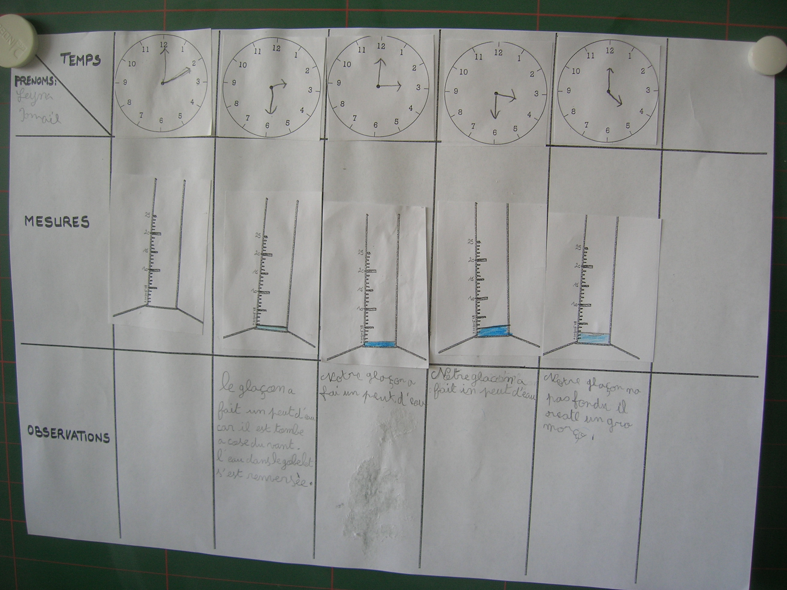 L'enseignant montre alors les éprouvettes qui serviront à mesurer la quantité d'eau fondue, nomme l'objet et explique puis pose les questions : "Comment noter les résultats et les regrouper ? Quels sont les éléments à ne pas oublier ?"
