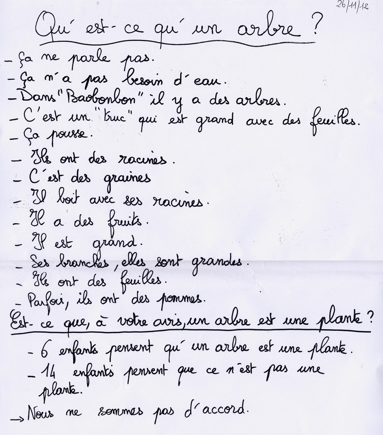 L'expérimentation sur les arbres étant difficile, celle-ci sera conduite sur des plantes de type herbacées. C'est l'occasion pour les élèves de construire la notion qu'un arbre est une plante et d'identifier les caractéristiques morphologiques partagées par les plantes (racines, tronc, branches (ou tige), feuilles, bourgeons, fleurs et fruits).On demande aux élèves de répondre collectivement aux questions suivantes : Qu'est-ce qu'un arbre ? Et est-ce qu'un arbre est une plante ? On recueille leurs réponses dans une affiche.