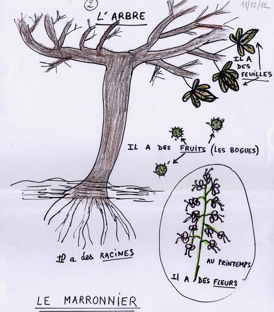 Collectivement un schéma de synthèse est réalisé pour fixer le lexique scientifique adapté : racines, tronc, branches, feuilles, fleurs, bourgeons, fruits.