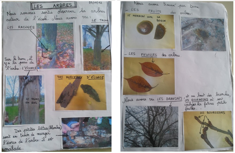 Les élèves réalisent individuellement le dessin d’un arbre, puis ils le légendent en dictée à l’adulte. Les élèves en difficulté sont aidés par un recours à l'observation directe d'un arbre (visible depuis la classe) ou indirecte (photographié lors de la sortie).