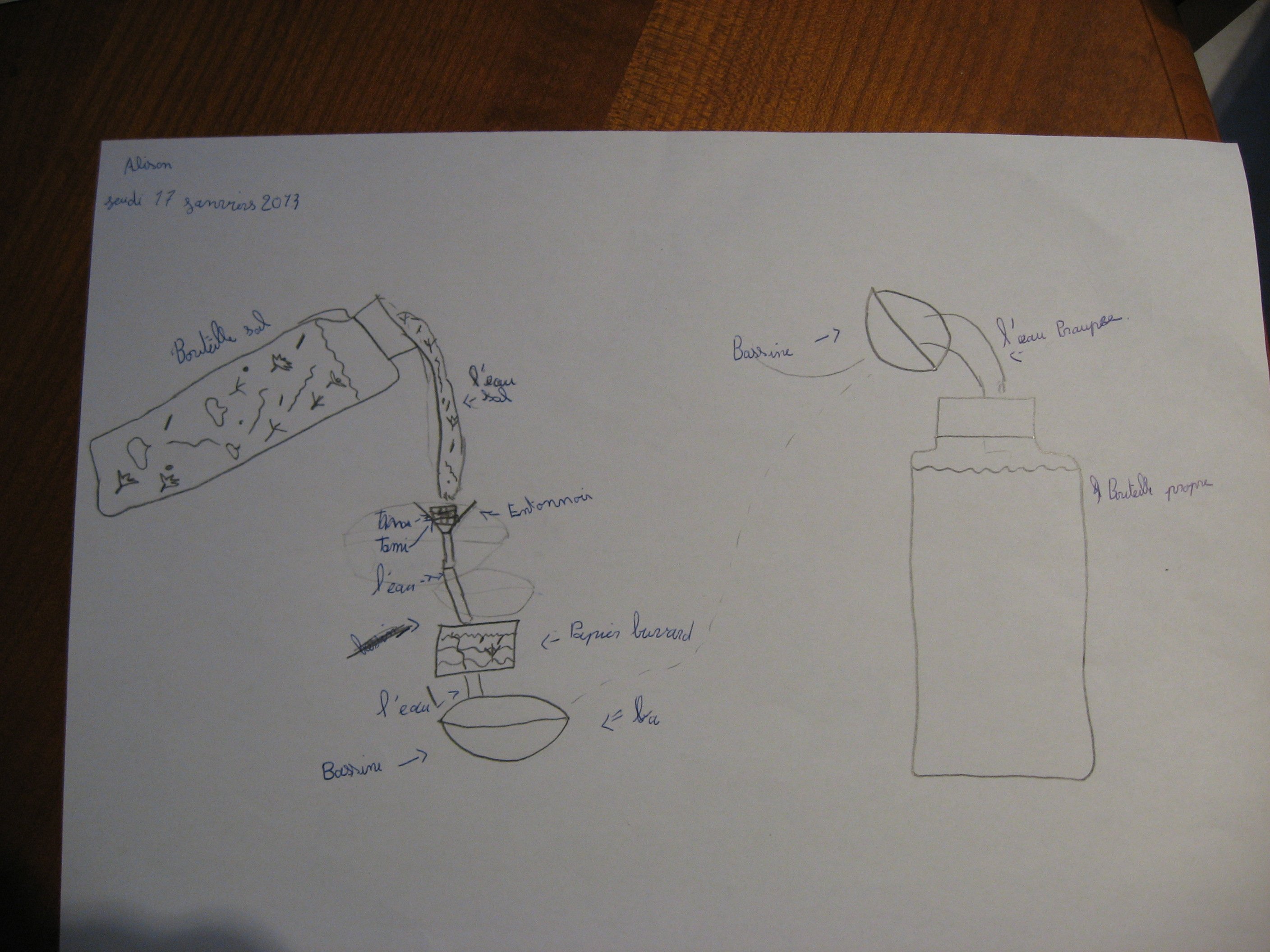 L'enseignant invite alors ses élèves à imaginer une expérience pour nettoyer l'eau, à dessiner et décrire le protocole expérimental, individuellement. L'enseignant passe dans les rangs afin d'accompagner les élèves qui en auraient besoin.