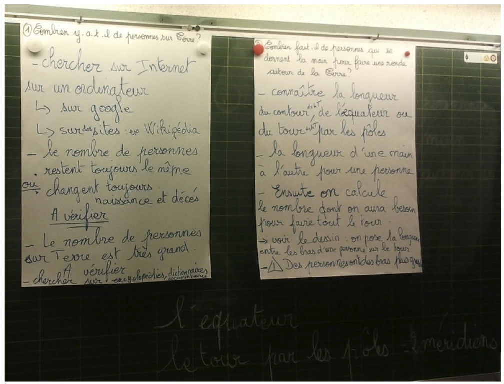 Il s'agit maintenant de résoudre le problème relatif au nombre de personnes nécessaires pour faire une ronde autour de la Terre. Les démarches proposées par les élèves lors de la phase 1 sont reprises.