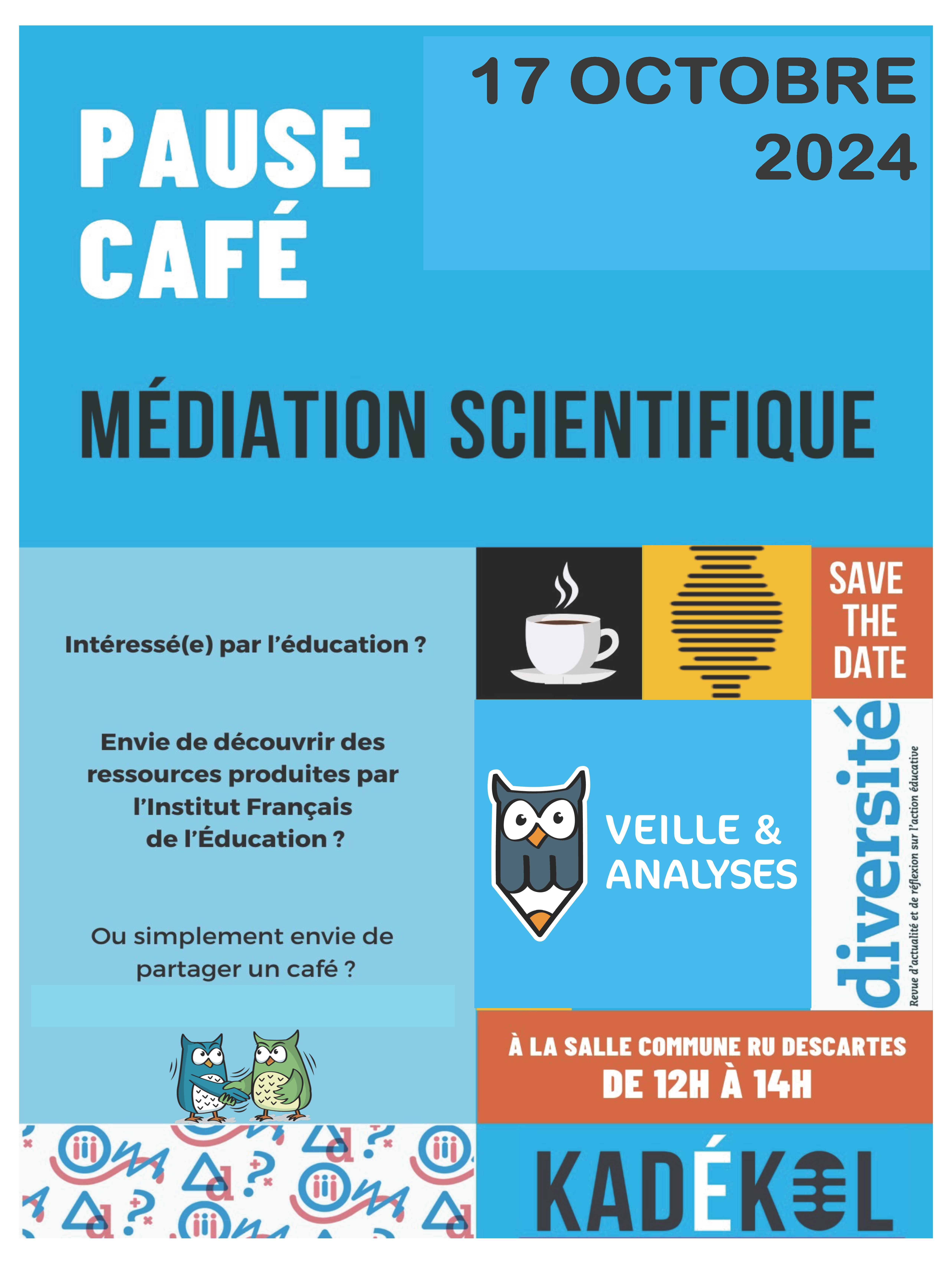 Les équipes de Kadékol, Diversité et Veille et Analyses de l'Institut Français de l'Éducation organisent un café/rencontre à destination des élèves, étudiant·es, enseignant·es-chercheur·es et personnels de l'ENS de Lyon, le 17 octobre 2024.