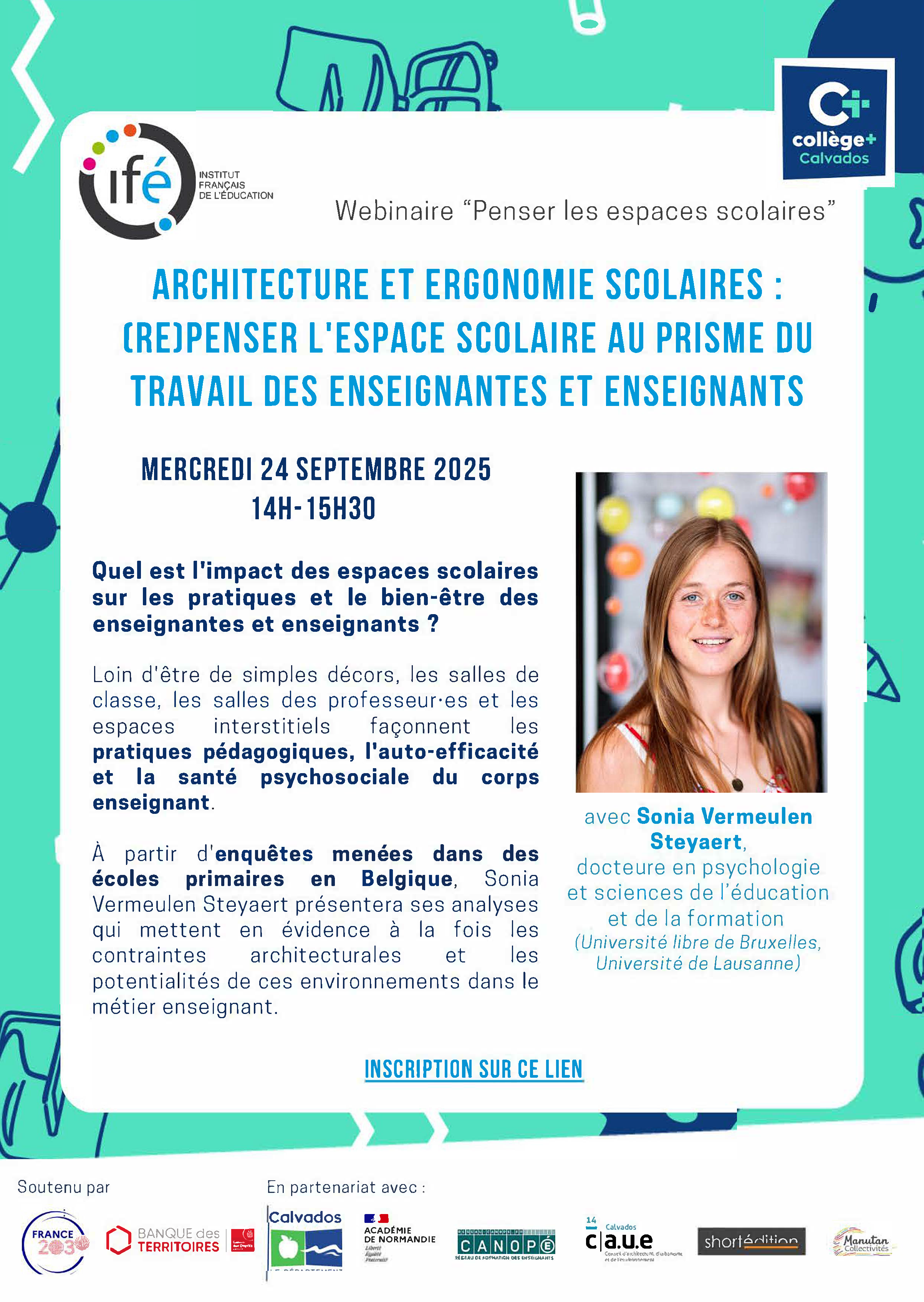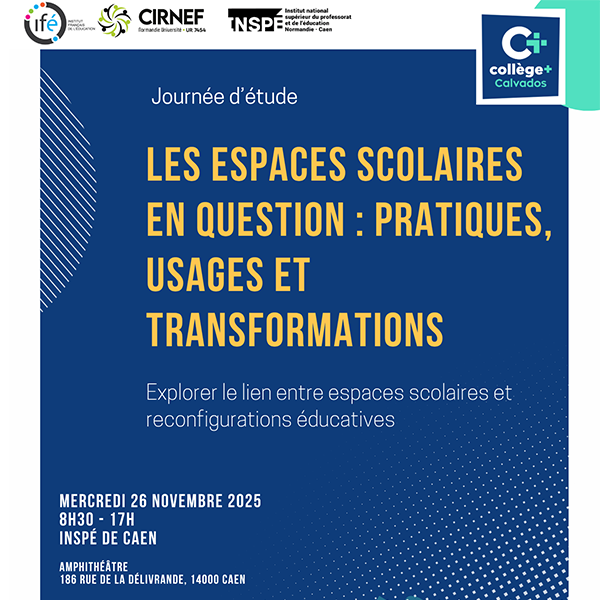 L'IFE et le Centre interdisciplinaire de Recherche Normand en Education et Formation (CIRNEF)de Normandie Université sont heureux de vous convier à la journée d'étude : "Les espaces scolaires en question : pratiques, usages et transformations" Explorer le lien entre espaces scolaires et reconfigurations éducatives
